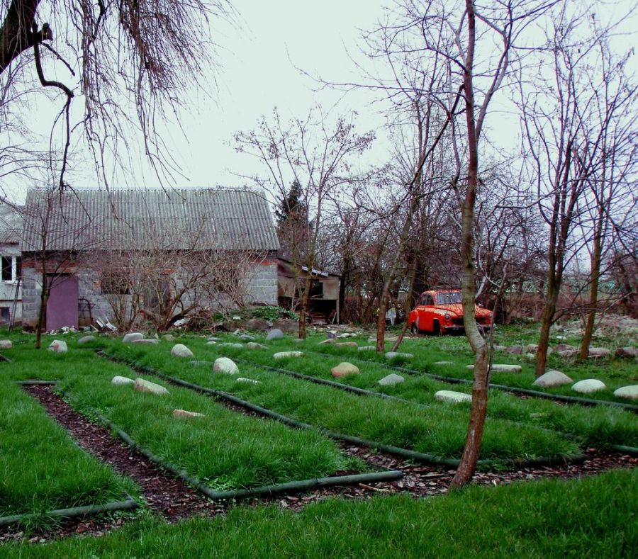 Pamiątkowy cmentarz jedenastu wsi w Cyganku, a zaraz obok gospodarstwo i stary samochód. Taka kolej rzeczy...