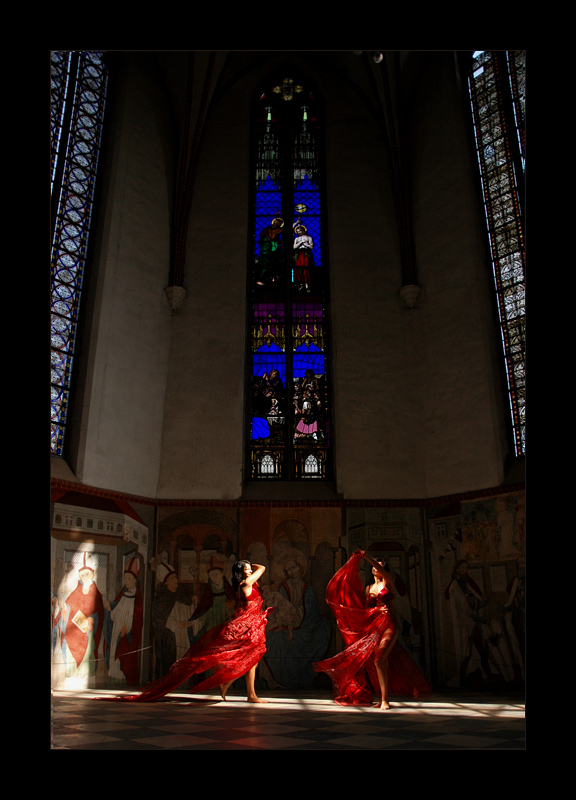 Wizja ciekawa, podwójna czerwona dziewica katedralna, znów pomarudzę usunął bym linkę z lewej strony oraz frgment kandelabra u góry. Gdybym to ja był autorem tej pracy modelka była by bezwzględnie nago
