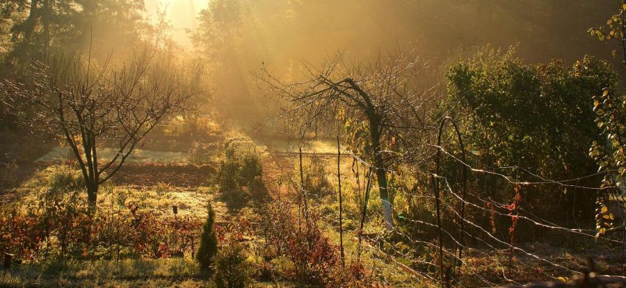 | Słowa kluczowe: | Drzewa krzewy płot promienie mgła trawa |