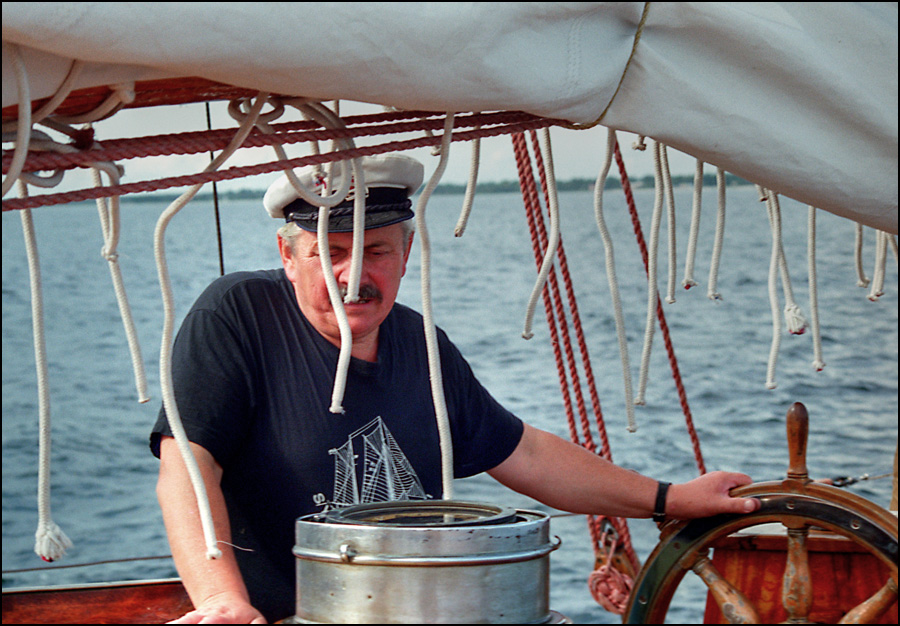 Jeden z przyjaciół w roli kapitana najstarszego polskiego żaglowca.