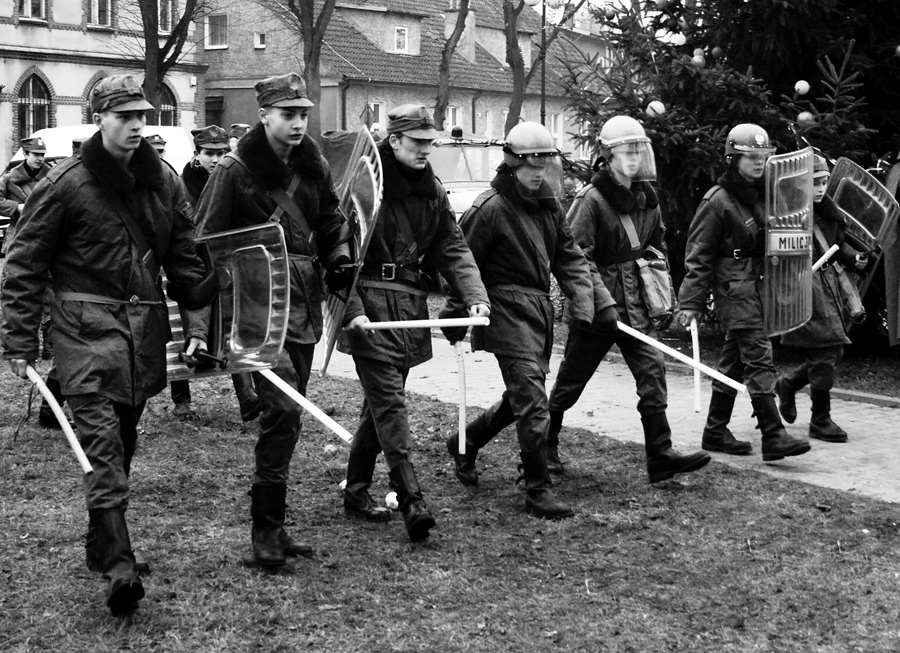 Zdjęcie zrobione podczas inscenizacji wprowadzenia stanu wojennego.