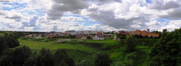 Jest to panorama osiedla piastowskiego, wykonana z nasypu kolejowego ( trasa: Kwidzyn - Prabuty ). Jest to pierwsza panorama jaką wykonałem. Co prawda mogłem użyć zoom'u, ale w tedy nie było by widać otaczającej osiedle zieleni, oraz przepięknych ( jak dla mnie ), sunących nad osiedlem chmur. Uważam, że jak na pierwszą panoramę jest całkiem całkiem.