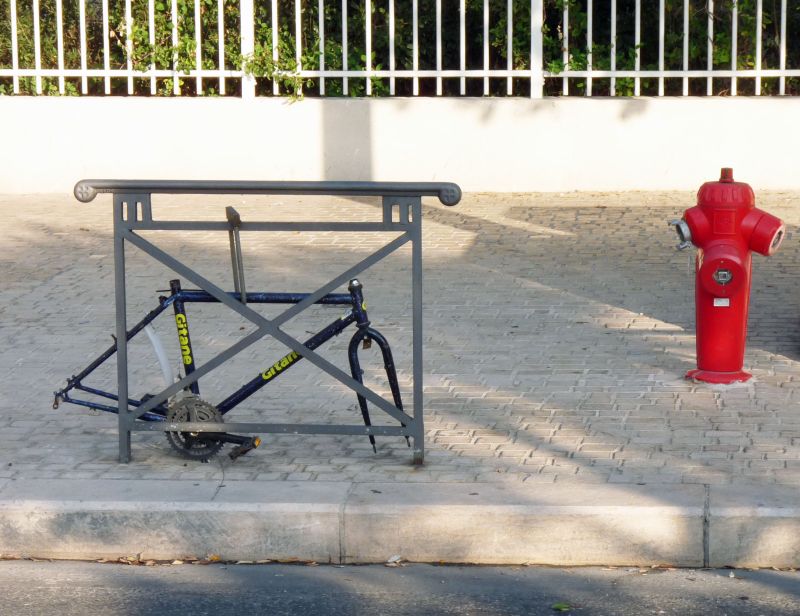 Zapomniany, ogołocony rower zaparkowany koło hydrantu na jednej z marsylskich ulic.