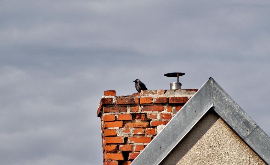 Ptak ogrzewający się przy kominie starego budynku