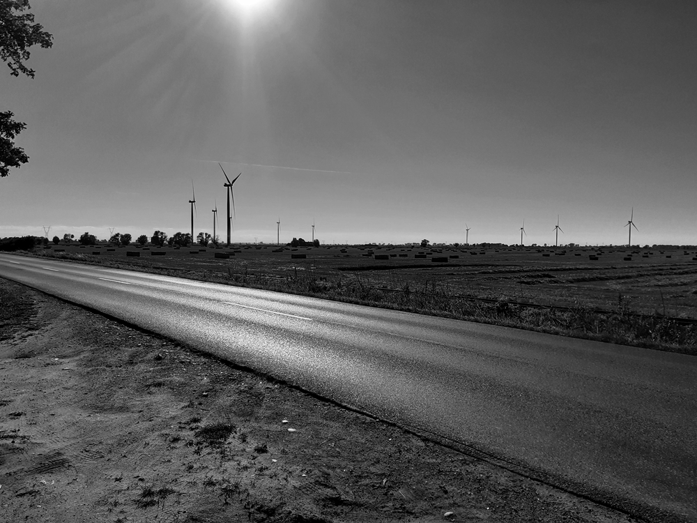 Droga i wiatraki kilka km. przed Stegną