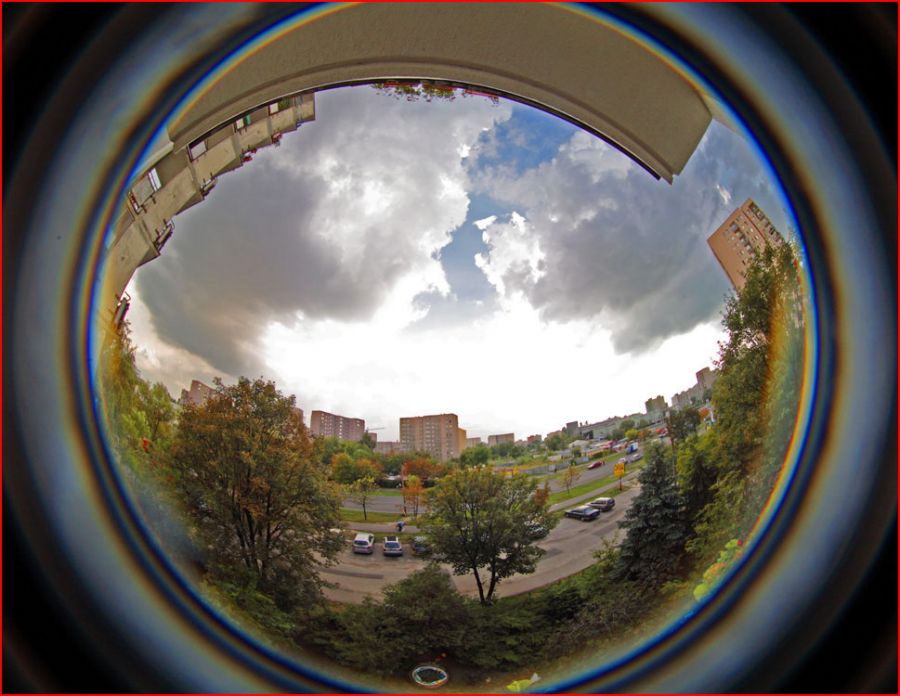 A w niczym. Tak wygląda obraz z obiektywu "rybie oko" kąt widzenia 180 stopni, odlotowo, nazwa obiektywu uzasadniona. podobnie widzą rybki np: karp wigilijny