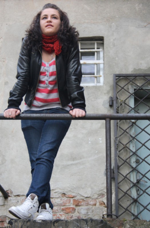 Krzywo raczej nie jest. Ja bym tu poprawił odrobinę kadr, czyli przesunął modelkę w lewo (jej prawo) do samej barierki widocznej z lewej strony. Dzięki temu z kadru wyleci krata w drzwiach a okienko ładnie wyłoni się zza modelki. Chyba w wyniku pomniejszania zdjęcia ucierpiała ostrość, warto poczytać o tym, w jaki sposób zmniejszać zdjęcia, aby jak najmniej straciło na jakości.