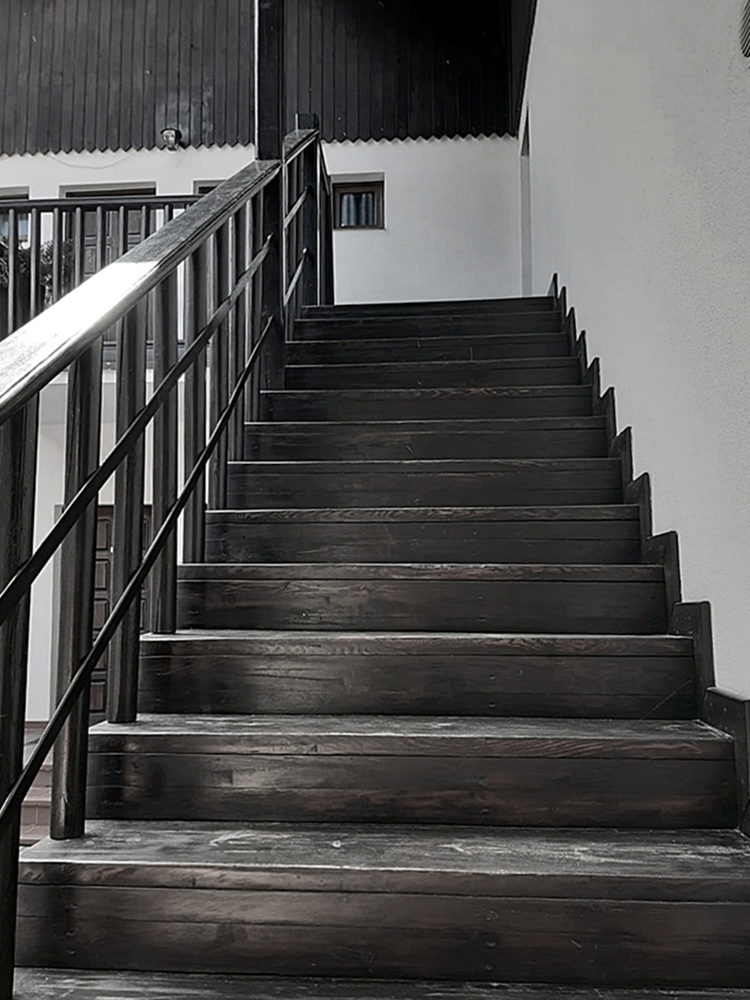 Pobierowo . Drewniane schody w pensjonacie do mojego pokoju