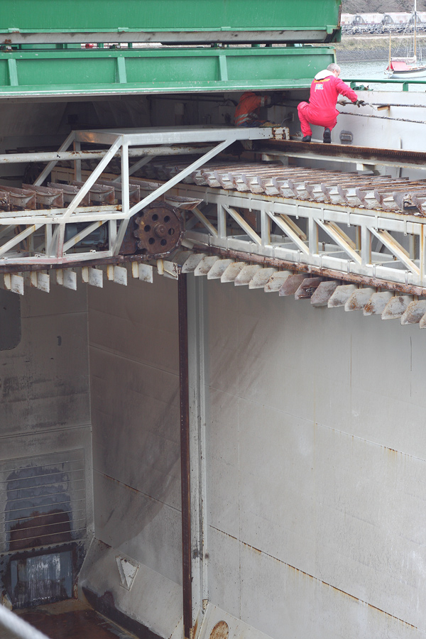 Na dole ładowni podwójny trójkątny element to dolny stoper mechaniczny (jeden z 4 w każdej ładowni) na którym całość się zatrzymuje kiedy opuści się już kompletnie do dołu.